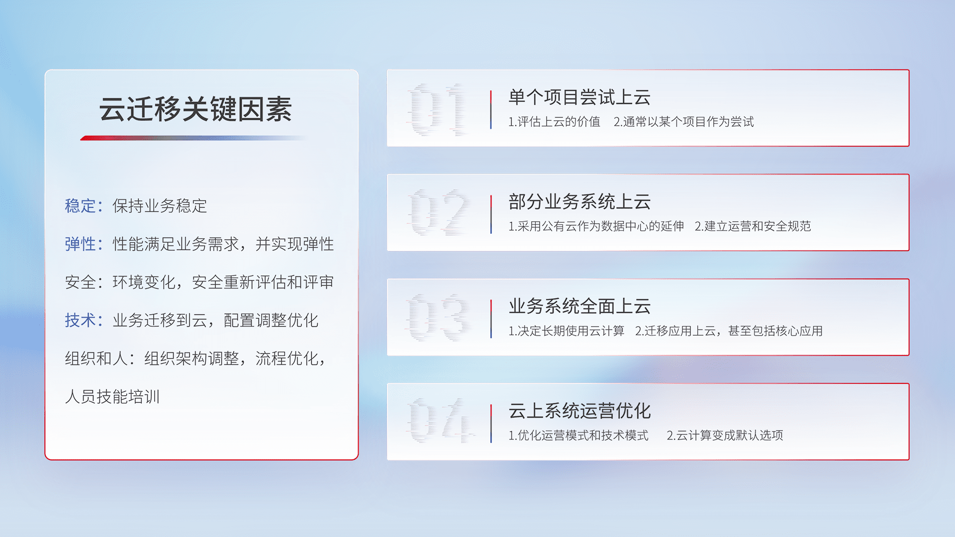 结合实际业务,,,,从规划设计、、、、云平台选型、、、云原生改造、、、、数据迁移、、、、集成交付,,,,迁移全过程为客户识别最佳上云路径,,,,做好风险识别管理,,设计网络架构、、、、身份权限、、、、安全审计合规、、操作审计、、日志审计、、监控告警策略、、、、多站点容灾设计等,,,,对云上基础设施进行整体规划,,提升IT治理水平,,以满足弹性、、、、高可用、、、高性能的需求。。