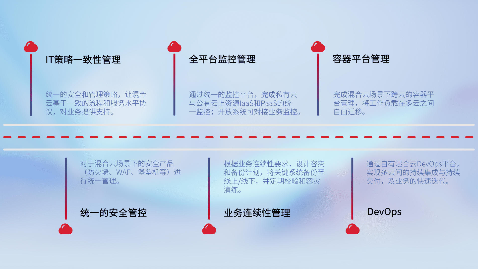通过多云纳管,,,,以统一的资源数据模型把客户的云资源进行抽象和封装,,,,进而实现对多云资源的统一操作,,,保障云资源管理的可靠性、、、、稳定性与可用性。。。量身定制化运维内容,,,,配置、、、开发运维、、补丁管理、、备份、、监控、、认证和访问管理、、、、审计和日常巡检等,,,,保障在用云过程中的可靠度,,稳定度以及高可用率。。。。