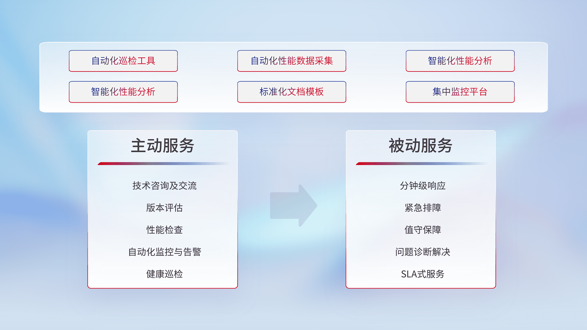 智能化工具和标准化文档,,,保障服务质量,,,提供主动服务(包含技术咨询、、、、版本评估、、、、性能检查、、、、自动化监控与告警、、、、健康巡检)和被动服务包含(分钟级响应、、、、紧急排障、、值守保障、、、、问题诊断解决、、SLA服务)。。