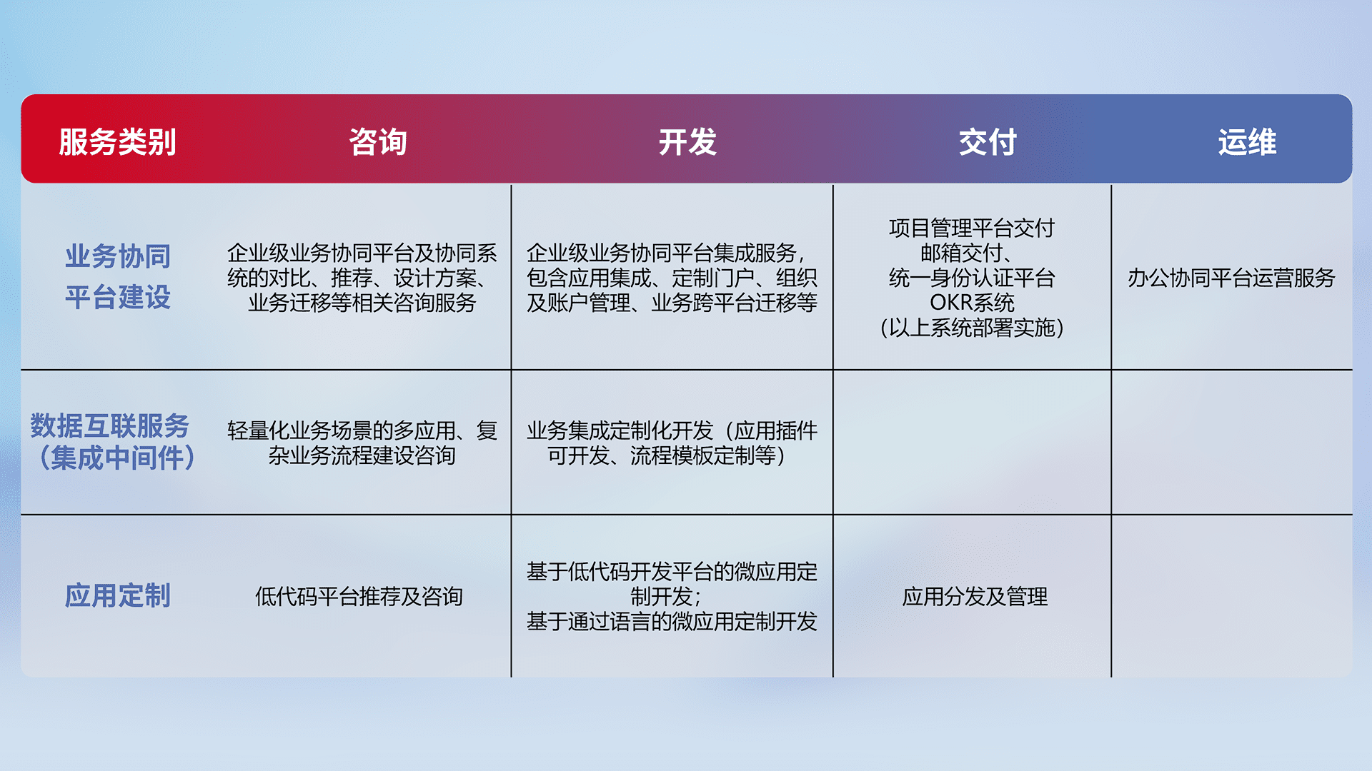 针对钉钉、、、企微、、、IDaas等平台级产品提供产品的规划、、方案、、、交付、、、、定制化开发等服务,,实现如统一协同办公、、、智能客户服务、、混合会议管理、、、智能数据查询、、、、等业务场景,,,,实现数字化转型。。。